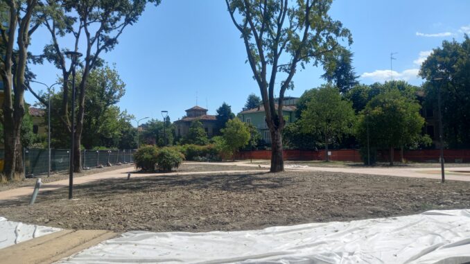 Da tempo il parchetto di fronte alla chiesa di S. Agnese a Modena è recintato per un intervento di riqualificazione che ha comportato anche il taglio di numerosi alberi, a detta del Comune, malati.