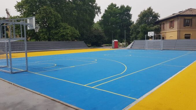 Il campo da basket al centro dell’anfiteatro è stato rinnovato e migliorato: il nuovo campo è più ampio rispetto al precedente e conta una dimensione totale di 30×18 regolamentare e potrà quindi essere utilizzato per manifestazioni sportive, oltre che per diverse discipline: pallavolo, calcetto, basket. Il tappetino in gomma colata in opera, oltre a un perfetto rimbalzo della palla, assicura resistenza agli agenti atmosferici ed elevata durabilità, mentre la pavimentazione antitrauma tra il campo sportivo e le gradonate migliora la sicurezza dell’intera infrastruttura. Infine, sono stati migliorati l’accesso al campetto e la visione, grazie all’inserimento di una rampa di accesso alle gradonate per l’abbattimento delle barriere architettoniche.