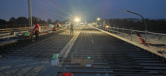 In dodici giorni di chiusura sono stati completati diversi interventi importanti: rimozione dell’asfalto, dei parapetti e dei guard-rail; demolizione dei cordoli e del marciapiede lato sud e lato ferrovia; ripristino del cordolo del ponte ferroviario vicino, con rinforzo dell’armatura; installazione delle piastre metalliche che reggeranno la nuova soletta in cemento; posa dei connettori tra la struttura in acciaio e la soletta; inizio della posa dell’armatura metallica, in preparazione al getto di calcestruzzo; posa dell’armatura che sosterrà la nuova passerella ciclopedonale, situata a lato collina, della larghezza di 125 cm.