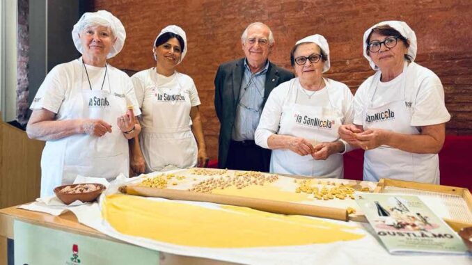 Il Tortellino Tradizionale di Castelfranco Emilia, tirato al matterello dalle Maestre Sfogline e cotto e servito rigorosamente in brodo di cappone, sarà tra i grandi protagonisti dell’edizione autunnale di Gusti.a.Mo 2023, in programma sabato 7 ottobre a Castelfranco Emilia. Oltre alla possibilità di degustare il Tortellino assieme a un buon bicchiere di Lambrusco dop, presso lo stand di Piacere Modena in Via Emilia a partire dalle 12,30, nella mattinata di sabato, alle ore 11, ci sarà un appuntamento particolarmente importante. L’Associazione la San Nicola, assieme alle Maestre Sfogline di Castelfranco Emilia, inaugurerà il nuovo show-room, delle Maestre Sfogline (Saletta Berselli), in piazza Garibaldi 6, di fronte alla Chiesa, che sarà dedicato alle vendite straordinarie dei tortellini, alle dimostrazioni di come si tira la sfoglia e come si realizzano i tortellini per turisti e aziende, e ad altri eventi. Appuntamento, come già ricordato, alle 11 con il brindisi del Tortellino e le Maestre Sfogline.