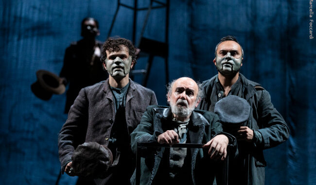 In scena accanto a De Capitani (che interpreta Achab, padre Mapple, Lear e l’impresario teatrale) troviamo Cristina Crippa, Angelo Di Genio, Marco Bonadei, Enzo Curcurù, Alessandro Lussiana, Massimo Somaglino, Michele Costabile, Giulia Di Sacco e Vincenzo Zampa. Il cast salda le eccellenze artistiche di tre generazioni di interpreti. La musica dal vivo di Mario Arcari e i canti diretti da Francesca Breschi (vibranti rielaborazioni degli sea shanties) riempiono intensamente la scena generando emozioni profonde, in uno spazio dominato da un fondale enorme, eppure leggero, cangiante e mutevole, capace di evocare l’immensità del mare e la presenza incombente del capodoglio.