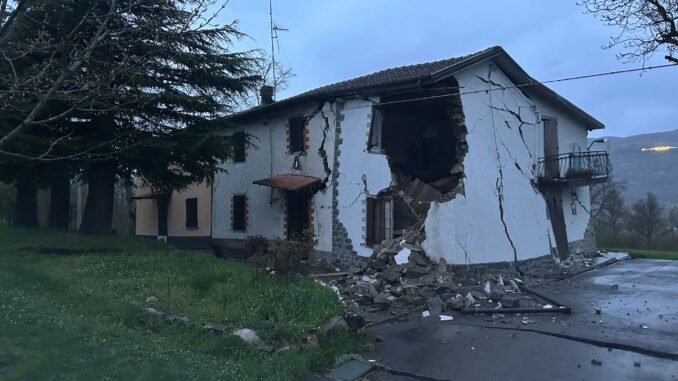 La frana di Boccassuolo di Palagano ha raggiunto le prime case su cui si sono aperte larghe crepe e che stanno crollando: il fiume di terra lungo ormai tre chilometri si muove nel sottosuolo al ritmo di 4 metri travolgendo tutto anche le fondamenta. Ora l’apprensione è per un traliccio che dà energia a quattro comuni.