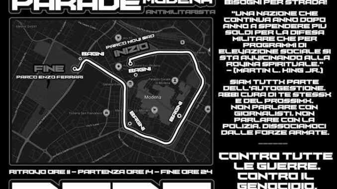 Corteo che partirà alle 14 dal Novi Sad (con ritrovo già dalle 11) per transitare in diverse strade cittadine (Monte Kosica, viale Crispi, piazzale Natale Bruni, viale Caduti in Guerra, largo Garibaldi, i viali del parco poi svoltare in via Vittorio Veneto fino a confluire al parco Ferrari.