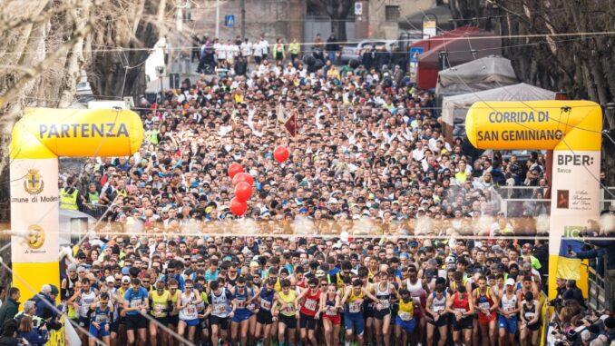 Come un anno fa è una bella giornata di sole a fare da cornice alla Corrida di San Geminiano. Il percorso che attendeva gli atleti era quello classico, con partenza da Viale Berengario per poi imboccare la Via Emilia tra le classiche bancarelle della Festa del Patrono e percorrere le vie del centro cittadino dirigendosi poi verso Cognento e ritorno con arrivo al Parco Novi Sad. L’ampia partecipazione popolare, come detto, ha impreziosito la giornata animata in zona arrivo dallo speaker d’eccezione Nicola Roggero affiancato dal compagno di telecronache, nonché testimonial di questa Corrida e dei 150 anni della Fratellanza, Stefano Baldini.