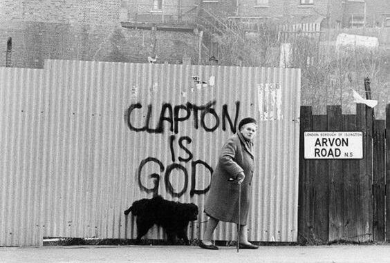 La storia inizia nel 1966, dal disco d’esordio di “John Mayall & the Bluesbrakers” con Eric Clapton. In quel disco, registrato in un giorno solo, c’è la Gibson Les Paul di Eric Clapton che canta dentro gli ampli Marshall, con un suono mai sentito prima e che farà apparire magicamente sui muri di Londra la scritta “CLAPTON IS GOD” (foto). Le registrazioni di quegli standard riporteranno il genere blues a casa, in America, inventando il guitar hero!