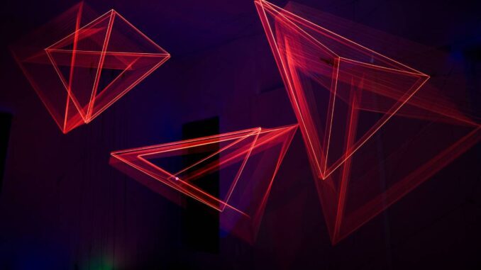 Tra rami d’albero che sembrano nascere dal nulla e vibrazioni cromatiche che sfidano la percezione, la mostra diventa un confronto di matrice pirandelliana tra essere e apparire. Lupi non si limita a esporre oggetti, ma crea ambienti immersivi dove la luce si fa memoria e conoscenza, obbligando lo spettatore a un ruolo attivo: qui, la verità dell’opera emerge solo attraverso lo sguardo di chi la attraversa. Sculture realizzate con fili di poliestere dipinti a mano consentono di creare affascinanti forme tridimensionali, mentre tetraedi cinetici, luminosi e sonori, realizzati anche con un complesso sistema di motori elettrici e carrucole, danno vita a immagini multiformi in un ambiente immersivo in continua mutazione. La mostra, spiega l’artista, invita lo spettatore a un ruolo attivo nella costruzione del significato delle opere e a riflettere sulla natura dell’immagine e sulla fragilità di ciò che definiamo “reale”, lasciandosi cullare da un’atmosfera di sospensione destinata a rimanere impressa ben oltre la visita.