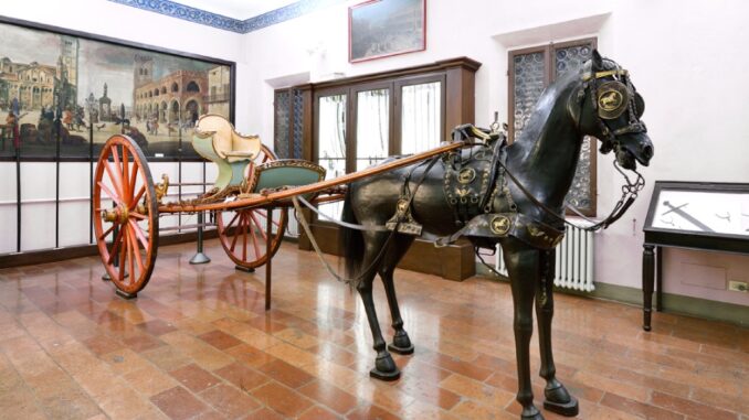 Il sediolo, detto anche calessino a posto unico, domina per le dimensioni e l’estrema raffinatezza dell’intaglio la sala delle armi del Museo Civico. Acquistato nel 1890 da Giannetto Boni, che aveva ceduto la raccolta di morsi da cavallo, è completo della predella per il palafreniere e della bardatura originale per il cavallo, oggetto del restauro. La costruzione del veicolo è attribuita all’intagliatore Antonio Luigi Del Buttero (S. Secondo di Parma 1765 – Reggio Emilia 1853), noto per aver lavorato presso la Corte estense. L’elegante struttura in faggio è arricchita da una preziosa decorazione ad intaglio con motivi di ispirazione neoclassica che suggerisce una datazione tra la fine del Settecento e i primi decenni dell’Ottocento.